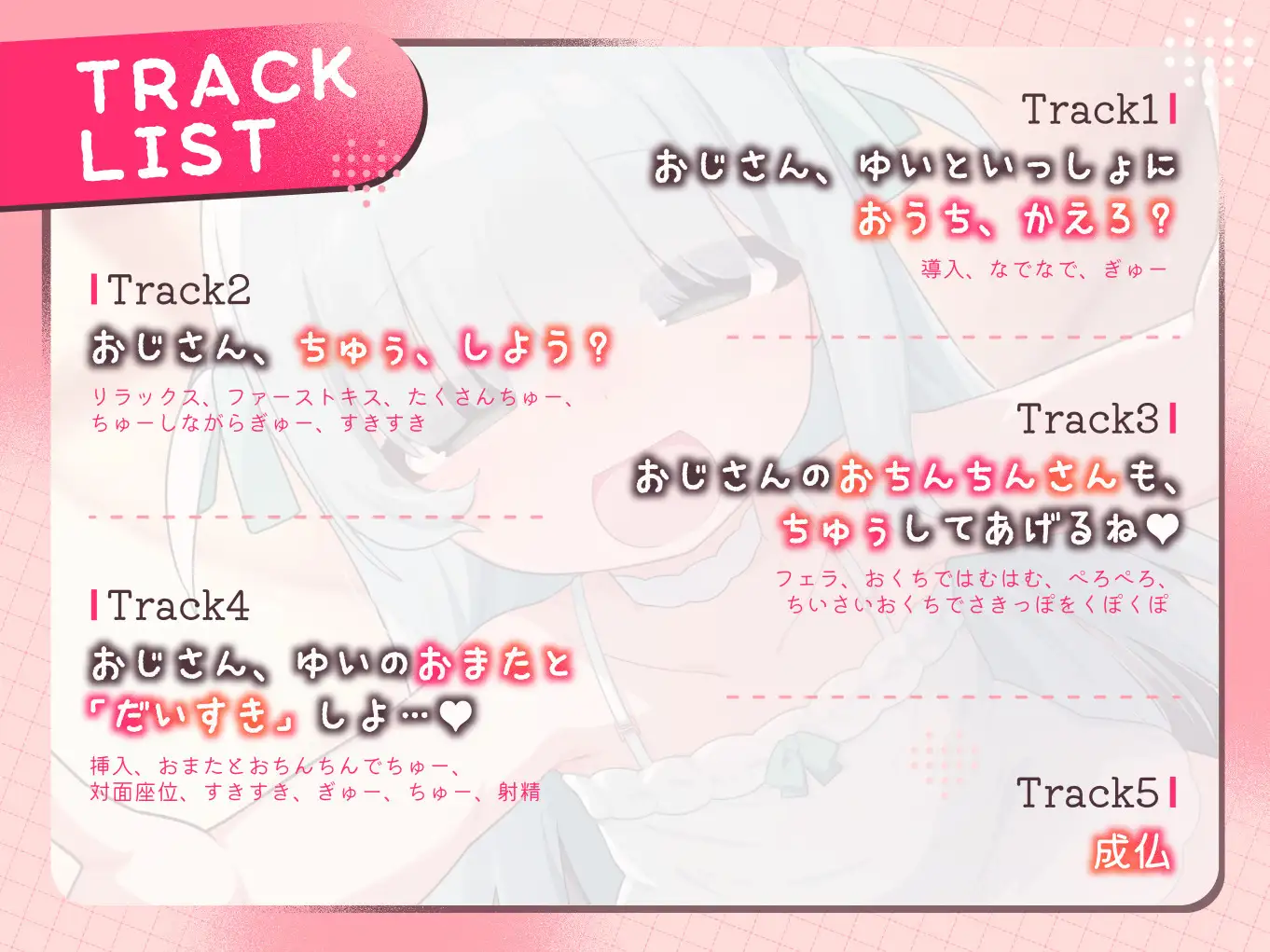 舌足らずな○リ声、密着ささやき、積極的な○リ、ねっとりキス描写、一生懸命なフェラ、すきすき連呼、密着あまあまえっち、よしよしなでなで甘やかしシチュが好きな人に特におすすめ!